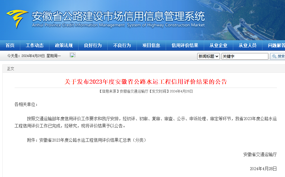 4月29日,安徽省交通運(yùn)輸廳發(fā)布消息,安徽省華軒交通建設(shè)工程有限責(zé)任公司在2023年度公路水運(yùn)工程信用評(píng)價(jià)工作中,被評(píng)定為安徽省2023年度公路養(yǎng)護(hù)施工企業(yè)信用AA級(jí)單位。